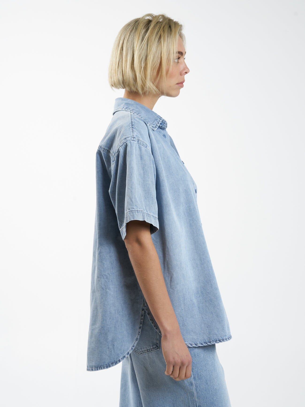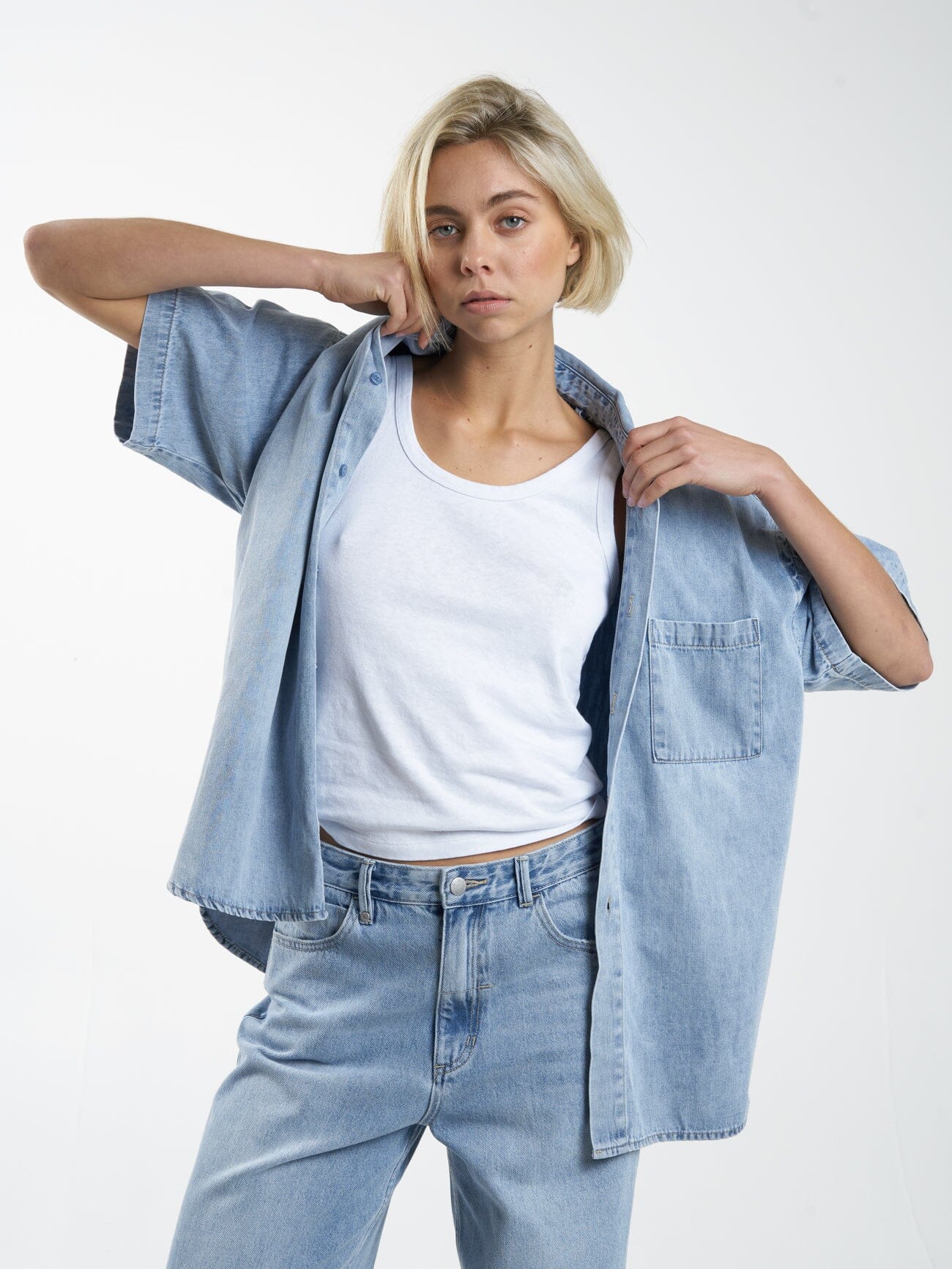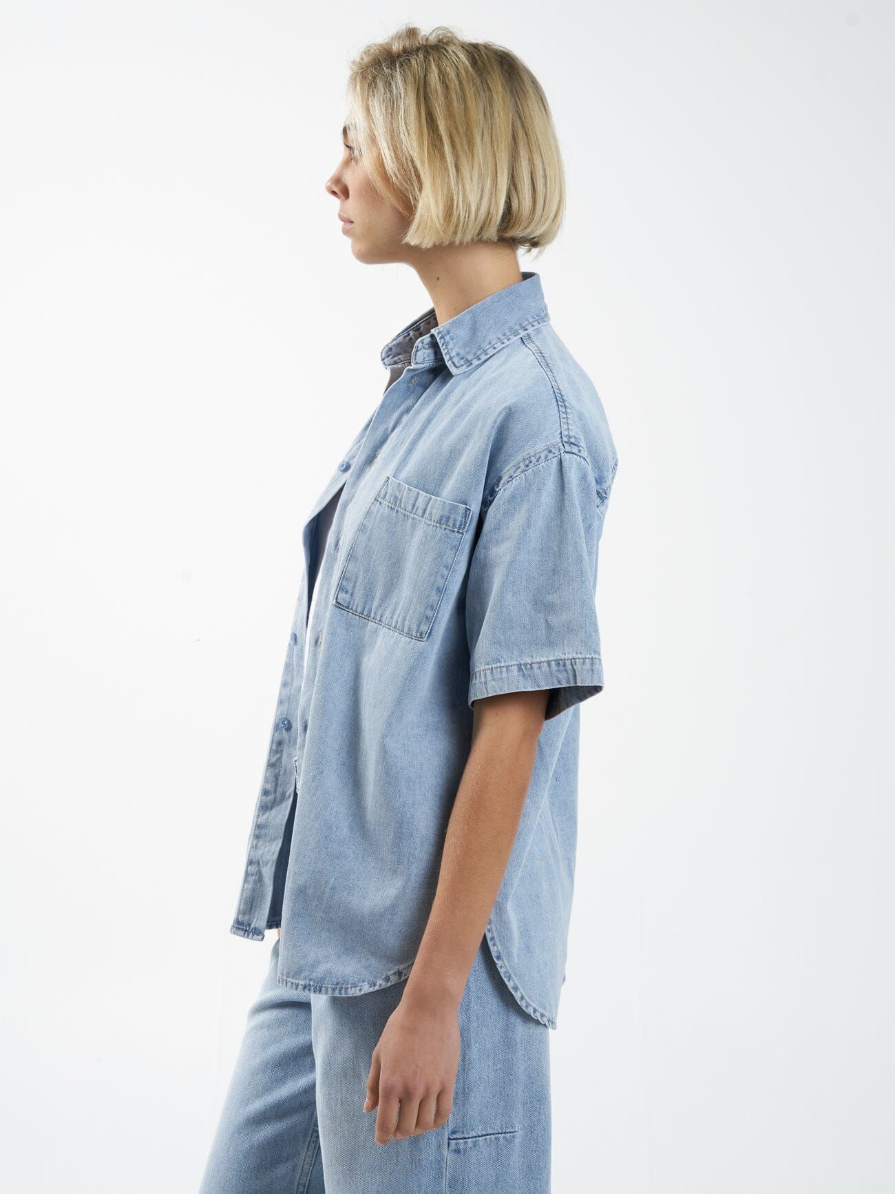 Designed to be a wardrobe staple. this Eliza Denim Shirt in Endless Blue bears classic features including a collar. a front pocket and an overall relaxed fit you can wear every day. Made with organic cotton denim. it offers durability but is still lightweight enough for layering. Available in a vintage-inspired wash. this denim shirt is both timeless and trendy.