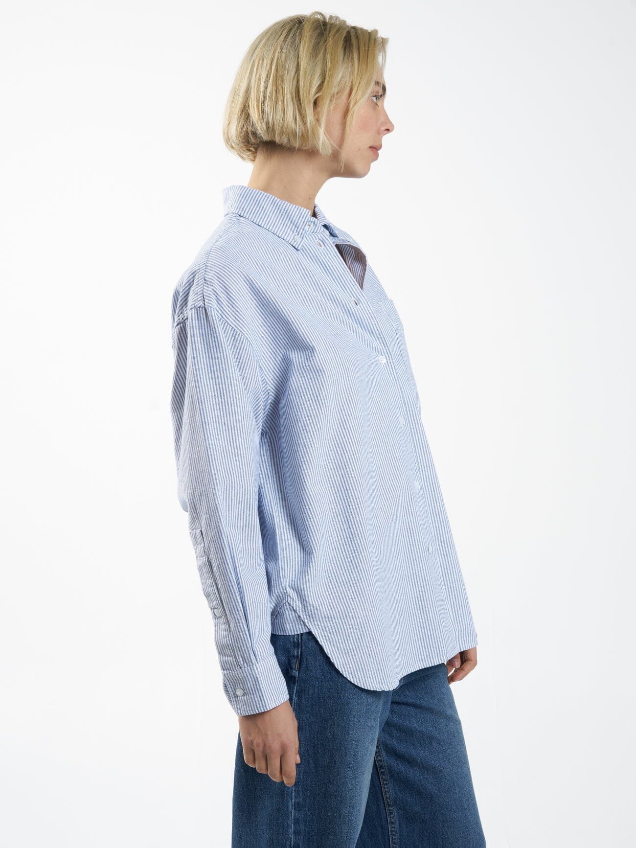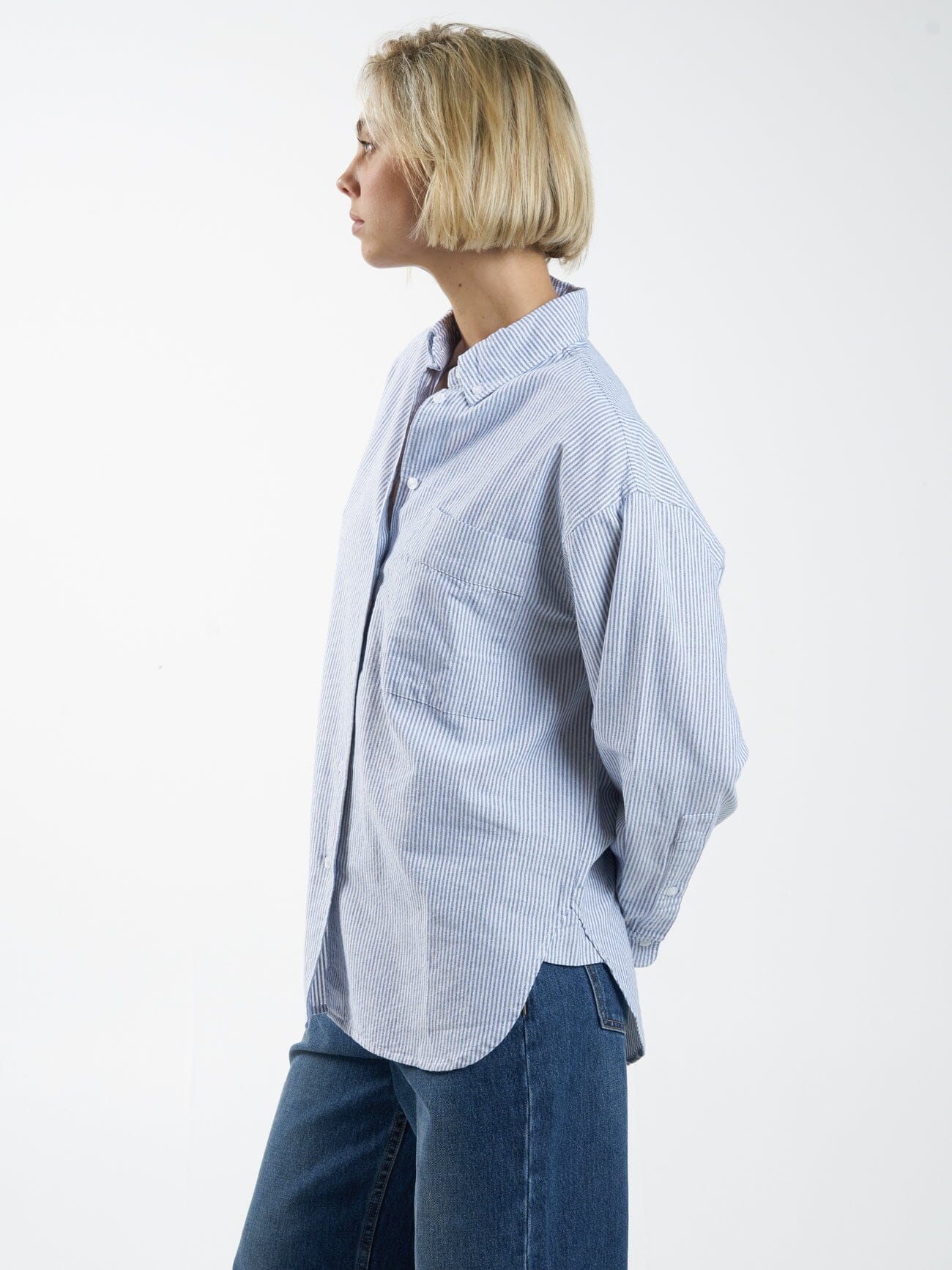 Offering a world of styling possibilities. this Maxwell Oxford Oversized Shirt in Royal Blue Stripe gives your outfit the smart casual treatment. With a loose. roomy fit and longer length. it’s easy to layer and style. Whether tucked. half-tucked or tied. this Oxford shirt for women is must-have for casual and even dressier events.